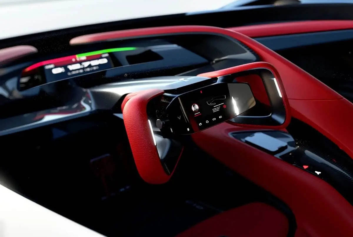 车辆内部则以简约的内饰为基础,一切功能和设计都以驾驶员为中心,整体中控台面集成了紧凑的结构设计并搭配以性能数据为展示重点的全液晶显示屏,同时 车辆还将搭配增强现实HUD,并显示最基本的数据,避免在高速下使驾驶员分心,专注高速驾驶。