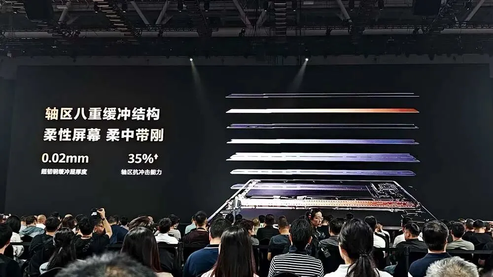 在细节技术方面,余承东提到了三折叠在铰链、内部结构、材料方面的升级,包括非牛顿流体材料、轴区八重缓冲结构、航天级特种钢。