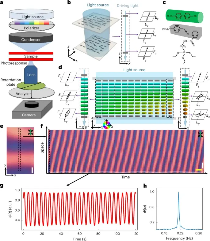 在实验中,研究人员将棒状液晶分子置于涂有染料分子的玻璃片之间。在特定光线照射下,这些液晶分子自发形成随时间重复的螺旋运动,产生大量新的“扭结”结构。这些扭结不仅能长时间维持运动,还会彼此作用,从而形成类似舞蹈般不断循环的复杂动态图案。