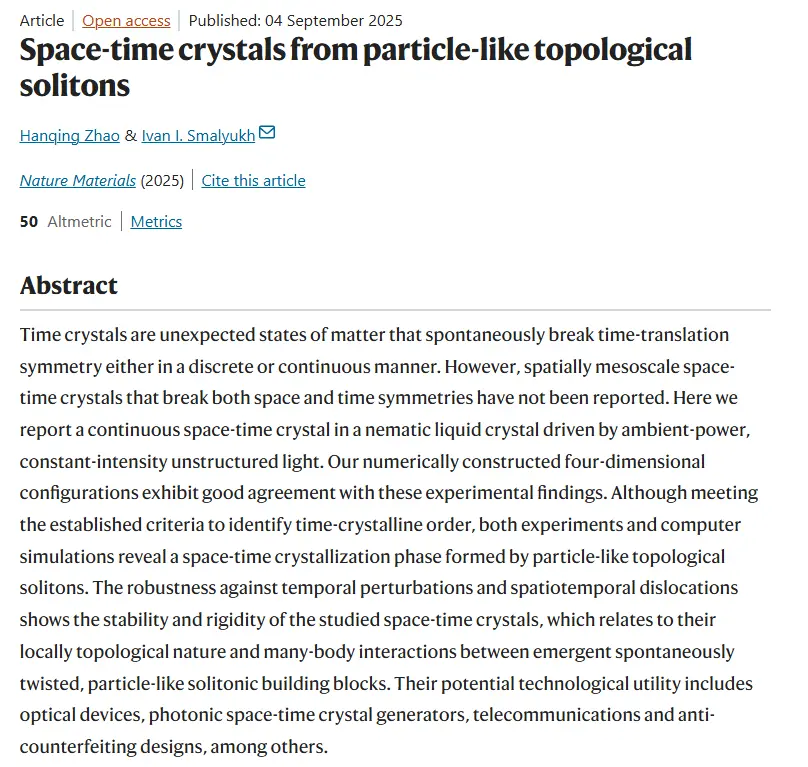 据介绍,其技术突破体现在环境适应性:研究人员升降样本温度时,液晶运动模式仍保持稳定。项目负责人、物理学教授伊万・斯马柳赫(Ivan Smalyukh)形容道:“一切从无到有。你只需要照射光线,整个时间晶体的世界便随之出现。”