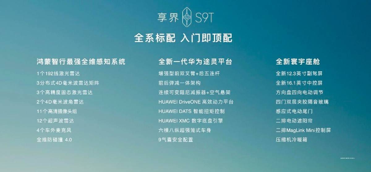 配置方面,享界S9T 搭载16.1英寸智能中控屏、12.3英寸副驾娱乐屏、全新MagLink Mini控制屏等超十屏智能座舱,带来更流畅的人车交互体验;新车标配华为悦彰音响卓越系列,采用专利双振膜涡轮超重低音单元,随享移动歌剧院。空间方面,车内乘坐空间高达1962mm,后排空间达1000mm;此外还有729L超大后备箱,后排放倒可拓展至1677L,装载能力媲美SUV。