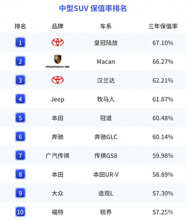 基于产品高品质基因的背景,一汽丰田也在市场上有着“开不坏的丰田车”之称。而在具体数据维度,根据中国汽车流通协会发布的《2025上半年中国汽车保值率报告》,一汽丰田荣获“行业标杆奖”,皇冠陆放以67.10%的三年保值率位居同级车型榜首。