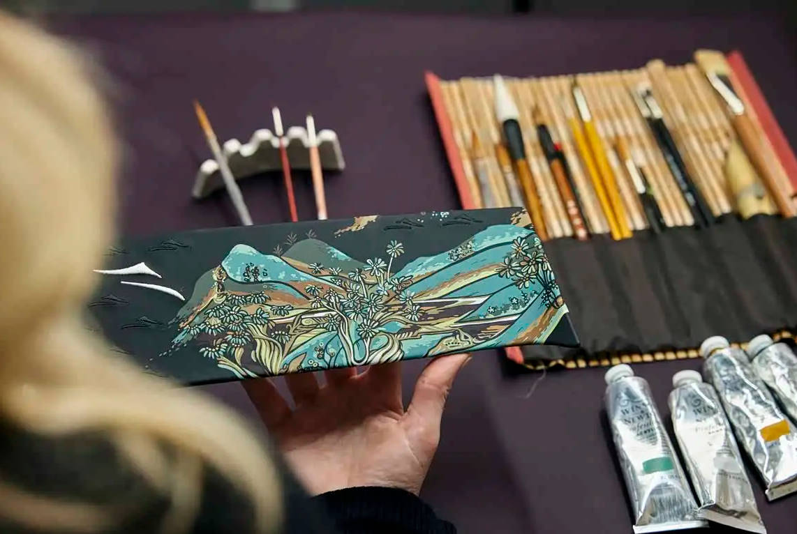 内饰方面,车内配备了手工绘制的定制画作。画作展现了敦煌壁画中飞天神女的景象,采用了中国传统的“减法木刻印刷”技法,每一层画作都通过细腻的画笔逐层渲染,以呈现深度和节奏感。座椅使用了黑色和喀什米尔灰色皮革,前后车门则采用了不同色调的Canadel木饰板。后门面板内嵌“不朽的丝绸”图案,象征着敦煌壁画中的艺术元素。