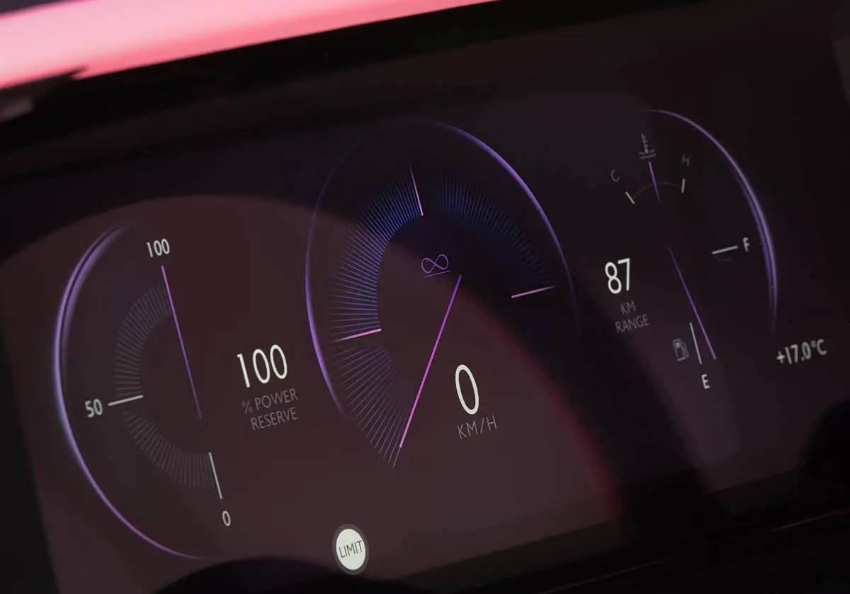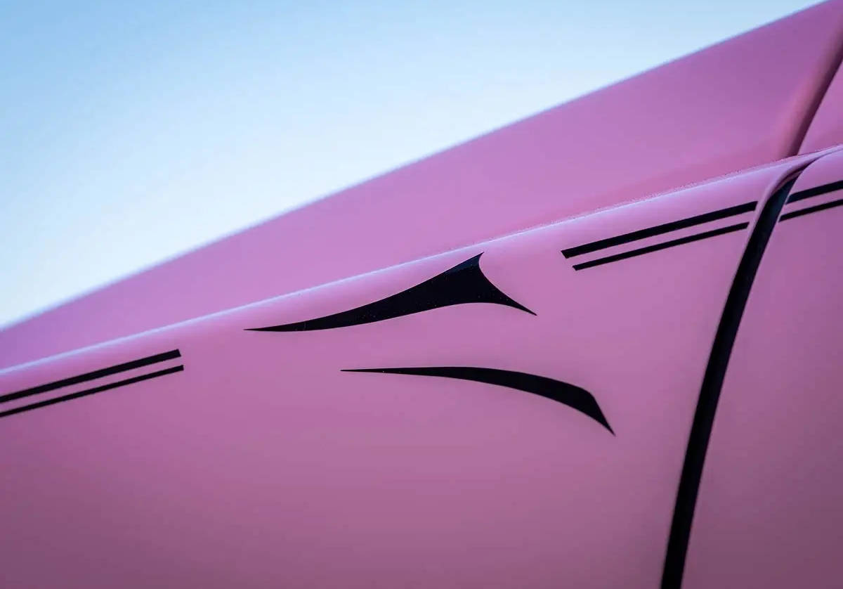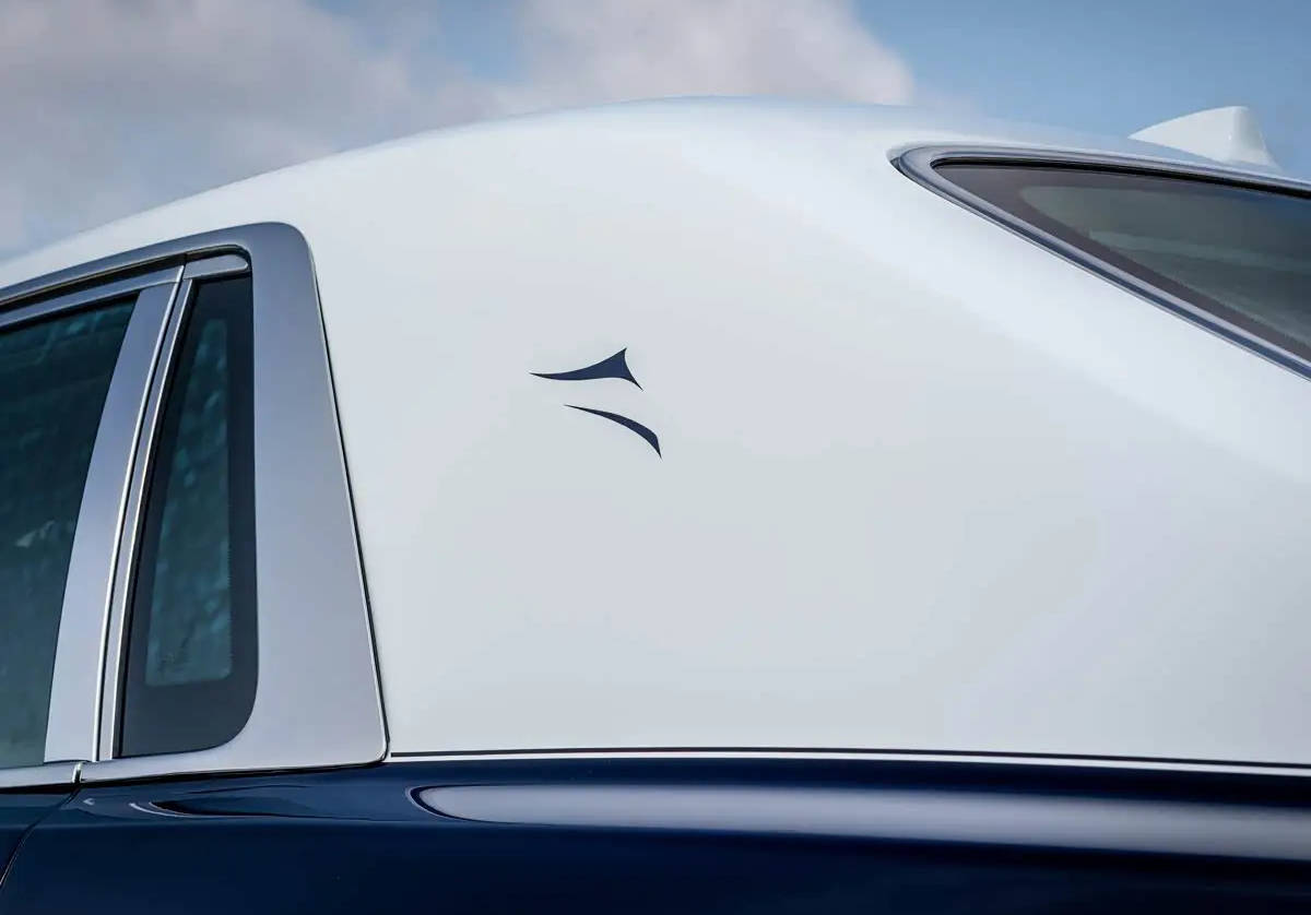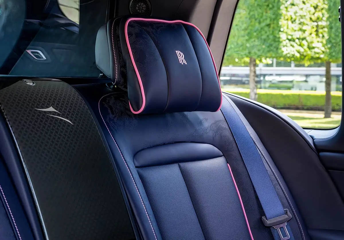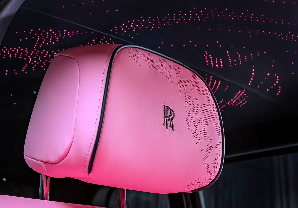 车内后排则采用了深蓝色皮革,配有腮红粉色的缝线和装饰,为车主提供更具沉浸感的氛围。前后车厢的头顶内饰与车内的色调完美契合,丝绸之魂图案以柔和的腮红粉色光芒呈现,搭配白色流星。
