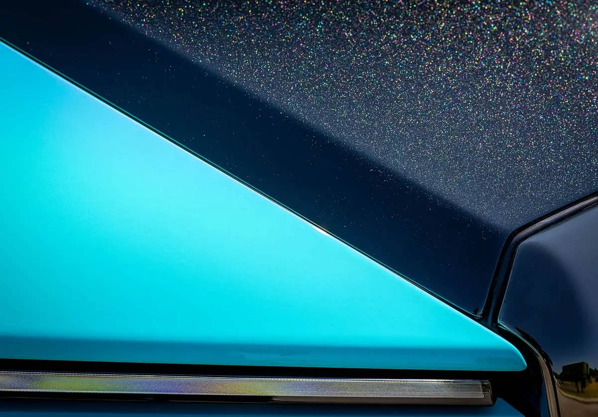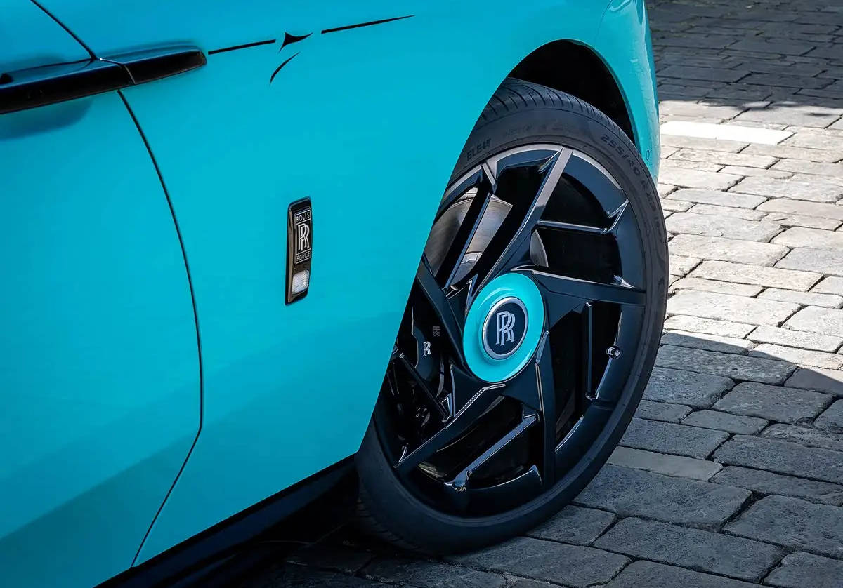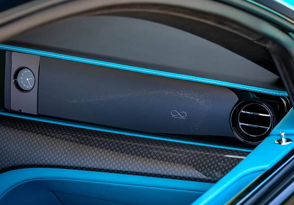 座椅采用绿松石色和黑色皮革搭配,后排座椅则为黑色,配有对比鲜明的白色缝线。车内的丝绸之魂图案被镶嵌在绿松石色的照明踏板上,此外,车门和定制星空头顶内饰也通过1,344颗星光与192颗流星为乘客带来独特的光影效果。