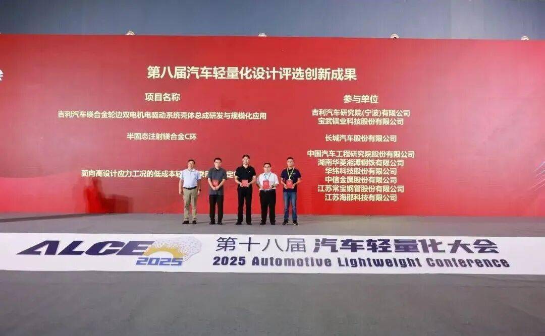 第八届“汽车轻量化设计大赛”评选共产生“创新成果”、“杰出成果”、“卓越成果”。“创新成果”项目为吉利汽车镁合金轮边双电机电驱动系统壳体总成研发与规模化应用,半固态注射镁合金C环,面向高设计应力工况的低成本轻量化乘用车稳定杆;“杰出成果”项目为高度集成悬架托臂一体式铸造桥壳和ESP短流程热成形钢;“卓越成果”项目为2200MPa高强韧铝硅热成形钢研制与产业化应用。