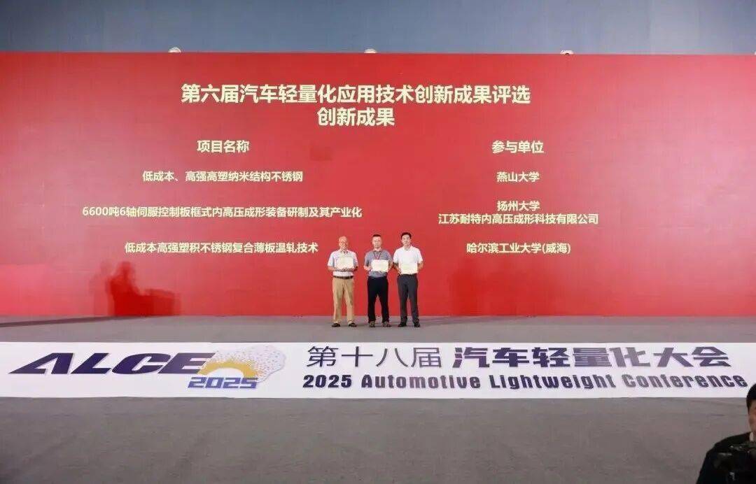 第六届汽车轻量化应用技术创新成果大赛评选共产生“创新成果”、“杰出成果”、“卓越成果”。“创新成果”项目为低成本、高强高塑纳米结构不锈钢,6600吨6轴伺服控制板框式内高压成形装备研制及其产业化,低成本高强塑积不锈钢复合薄板温轧技术;“杰出成果”项目为车用高强韧高疲劳铝合金制备关键技术及应用和轻合金/超高强钢异质金属电阻铆焊复合连接工艺与装备;“卓越成果”项目为激光辅助机器人无模滚压成形技术与装备。