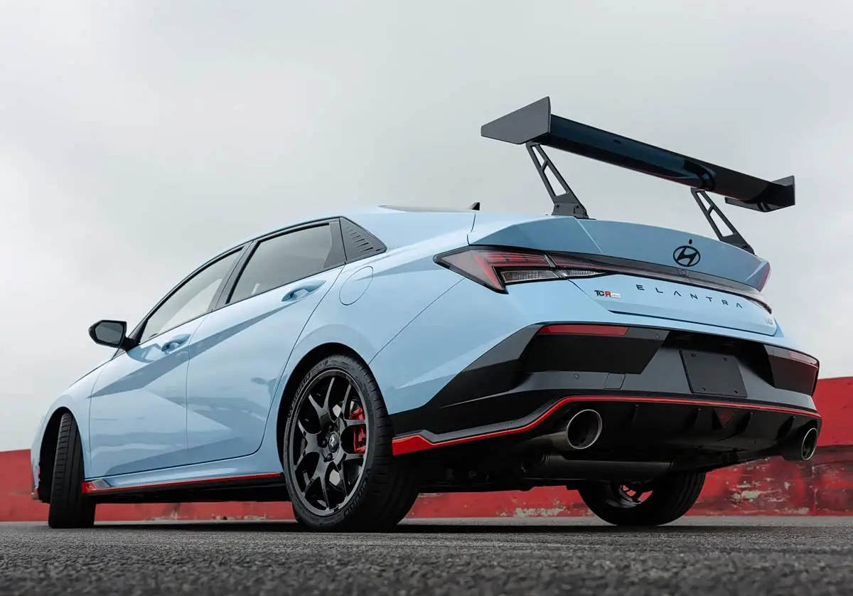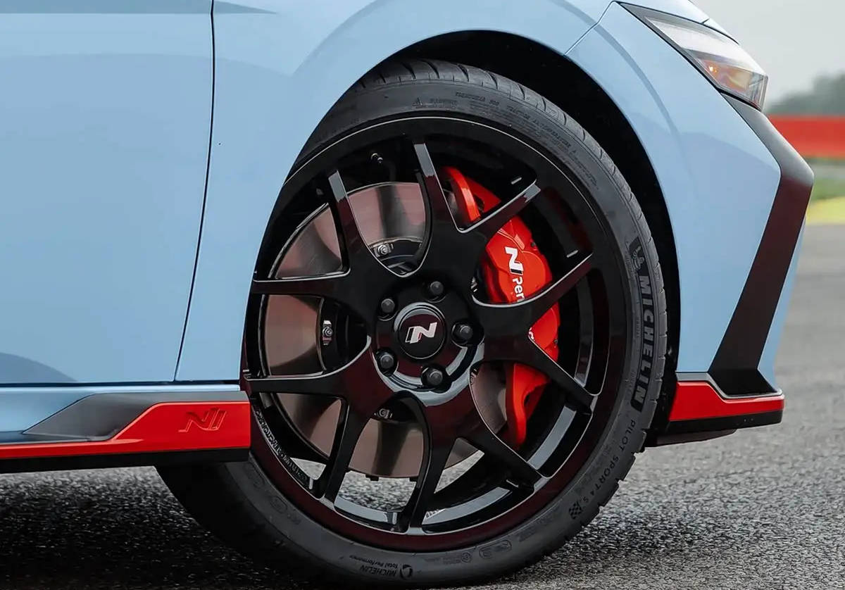 外观方面,新车整体设计依旧遵循伊兰特N的思路,但是加入了更多的空气动力学套件。例如新车增加了红色装饰点缀的前唇扰流板,同时配备了双五辐的19英寸N TCR锻造轮圈。此外,新车还配备了前四活塞的固定式制动卡钳,进一步提升整体赛道性能。