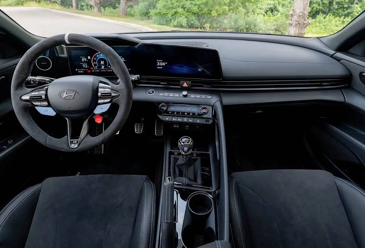 内饰方面,新车整体布局与伊兰特N相差不大,但配备了“N性能”Alcantara方向盘,并带12点钟回正标记,同时前排配备蓝色安全带,车门槛处使用了N性能金属门槛护板、车内还有N性能脚垫、以及大量的Alcantara内饰套装,例如在手动驻车制动杆、换挡杆及扶手箱扶手位置,最后还有“TCR版”标识门把手灯,情绪价值拉满。