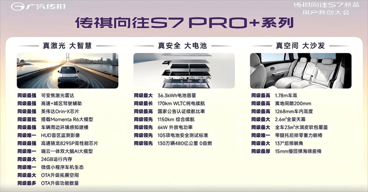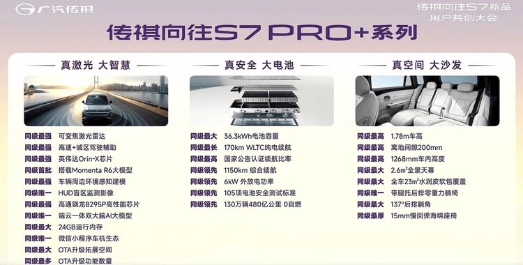 本次上市的两款传祺向往S7 Pro+版,与定位全系入门的115km Pro版相比,核心产品差异集中在电池容量与续航里程两大核心维度。配置层面,这两款Pro+版在保留基础功能的同时有所调整:一方面新增了隐藏式主动进气格栅与底盘护甲,提升了实用性;另一方面则相比115km Pro版减少了主驾座椅4向腰托、副驾座椅老板键、第二排侧面安全气囊及双腔远端安全气囊。