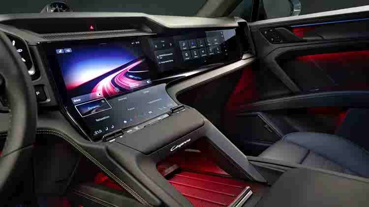 而内饰的改变也更为科技,纯电版Cayenne搭载了 “Flow Display” 曲面 OLED 屏幕,不仅是一块显示面板,更是保时捷对未来车载交互的全新诠释,垂直安装的曲面屏打破了传统车载屏幕的方正框架,底部以柔和的弧度自然弯折,巧妙地将屏幕划分为上下两个功能区:上方是始终处于驾驶员视野范围内的显示区,可实时呈现驾驶模式、续航里程、导航路线等核心信息,避免驾驶员分心;下方则是操控区,配合与屏幕弧度同步适配的菜单界面。