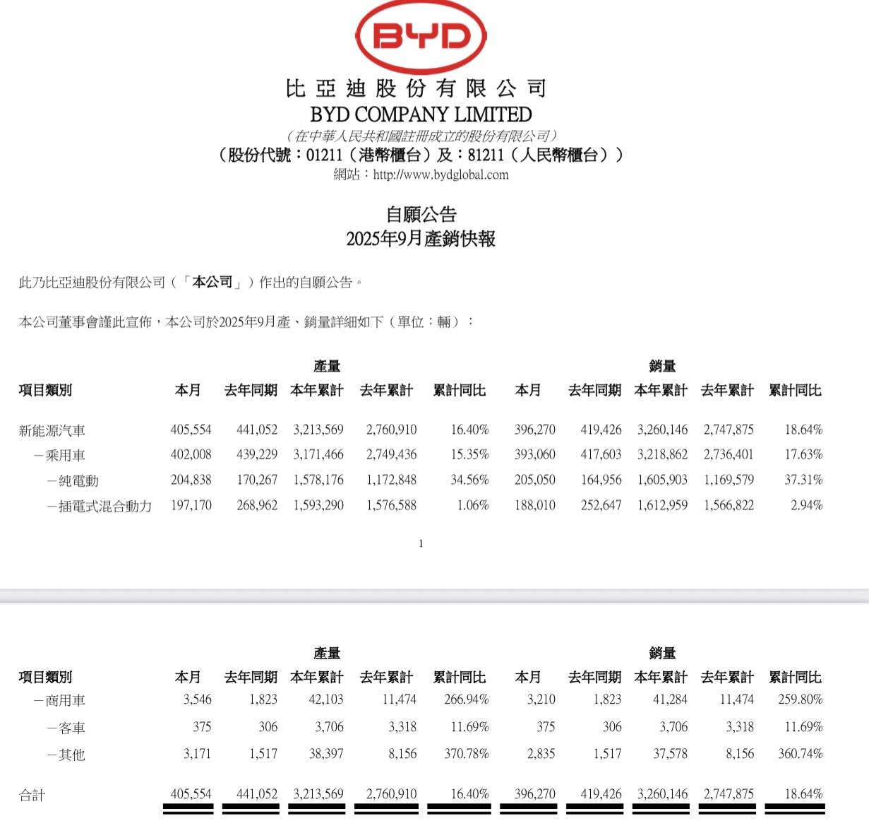 10月1日,比亚迪股份披露9月产销快报。