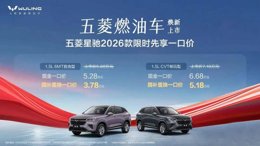 7月22日,2026款五菱星驰正式上市,新车共推出两个配置并采用限时一口价政策,其中1.5L 6MT自由型现金一口价5.28万元;1.5L CVT畅玩型现金一口价6.68万元。