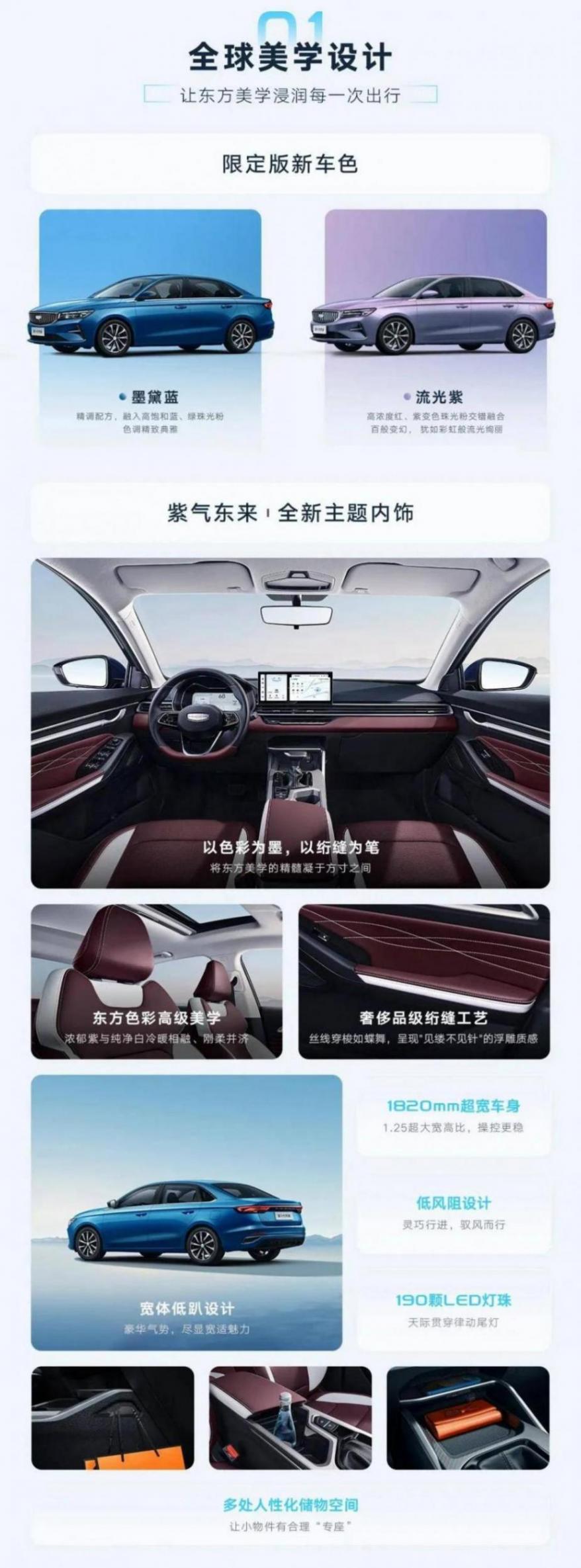 车内则依旧采用12.3英寸中控大屏+10.25英寸全液晶仪表的组合,搭载银河OS车机系统,新增双拼色主题内饰。此外,帝豪400万纪念款车型还支持手机App远程控制。