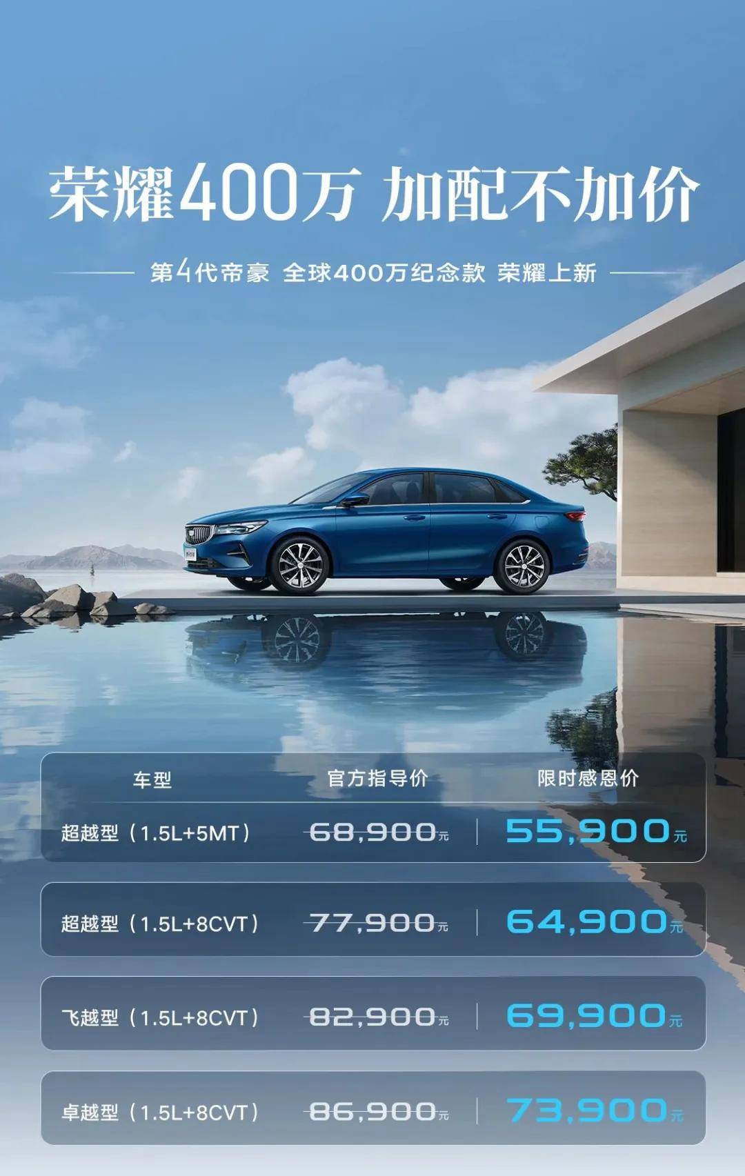 除了SUV之外,还有许多消费者想要购买入门级的轿车,7月9日,吉利帝豪400万纪念款正式上市,新车共推出4个车型版本,限时感恩价5.59-7.39万元。