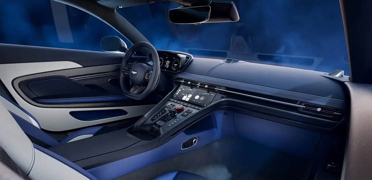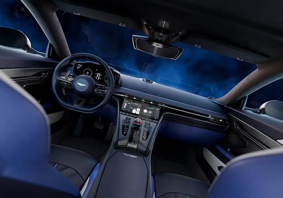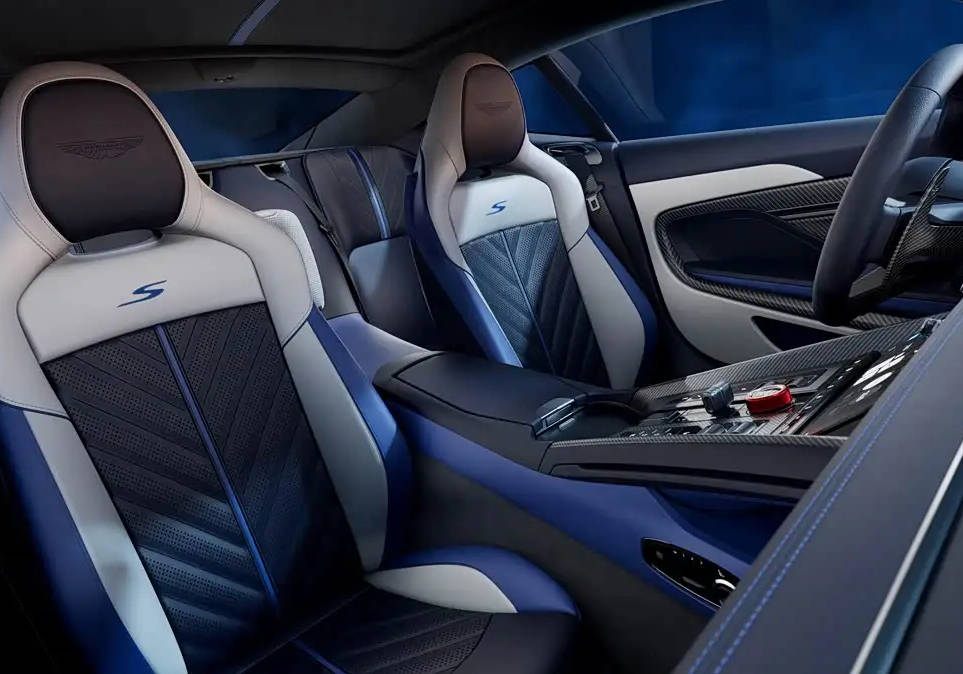 新车的内饰基本与普通版DB12保持一致,仅对部分细节进行了调整。新车应用了三幅式方向盘,白蓝黑三拼色内饰与外观呼应,座椅上有蓝色的“S”徽标刺绣。空调出风口下方的内嵌式中控屏幕可以调节空调,再往下是换挡拨杆及大量的物理按键,包含驾驶模式选择、座椅加热等功能。新车配备宝华韦健的音响系统,保障音乐质感。
