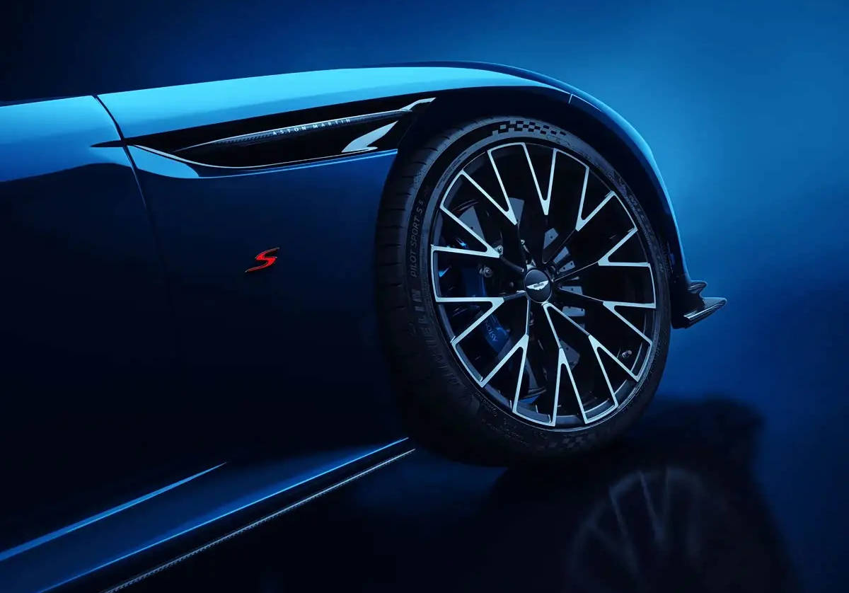 车侧可以看到新车采用双拼车色,下半部分为蓝色,上半部分为黑色悬浮式车顶,进一步增添运动氛围。同时,新车标配了碳陶刹车,这在普通版DB12上需要花14500美元选装。新车前轮翼子板后有红色的“S”徽标,彰显高性能身份。