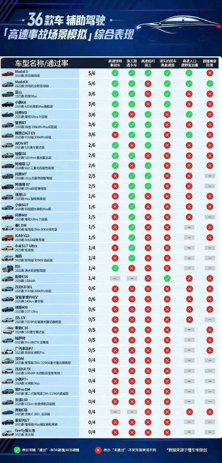 品牌表现呈现断崖式分化:特斯拉Model 3与Model X在高速测试中以5/6的通过率霸榜前二;自主品牌中以3/6通过率位居第三,成为国产车最佳;而问界M7/M9、阿维塔07等“华为系”车型频现系统犹豫与违规变道;极氪007、等15款车型多个项目得分为零,在安全底线前集体失守。