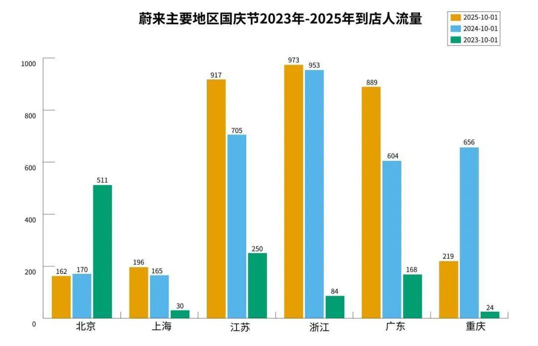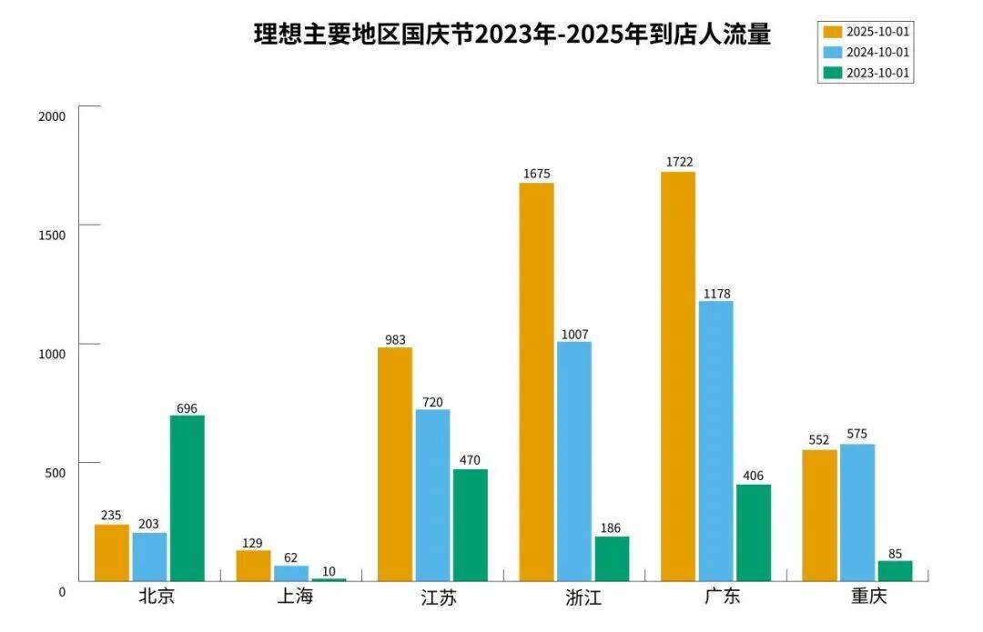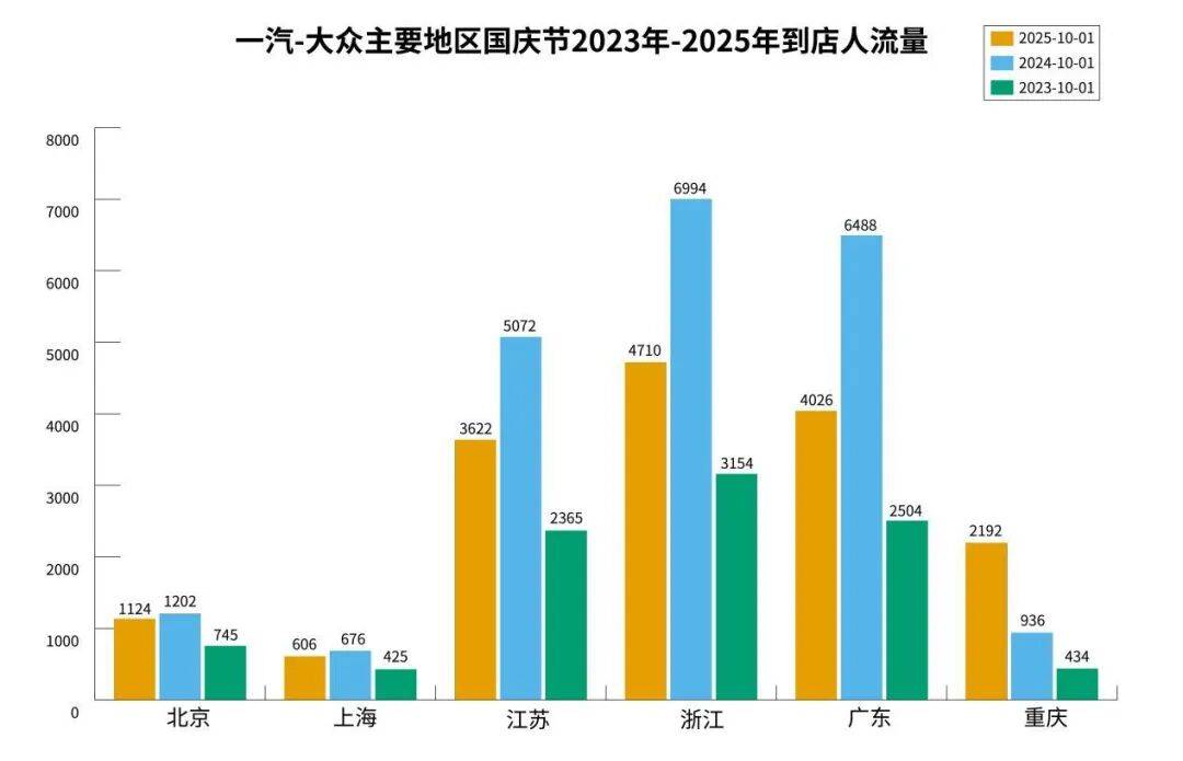 内文中的柱状图分别是2025年10月1日、2024年10月1日和2023年10月1日北京、上海、广州、江苏、浙江和广东各品牌4S店的到店客流,以人数为单位。
