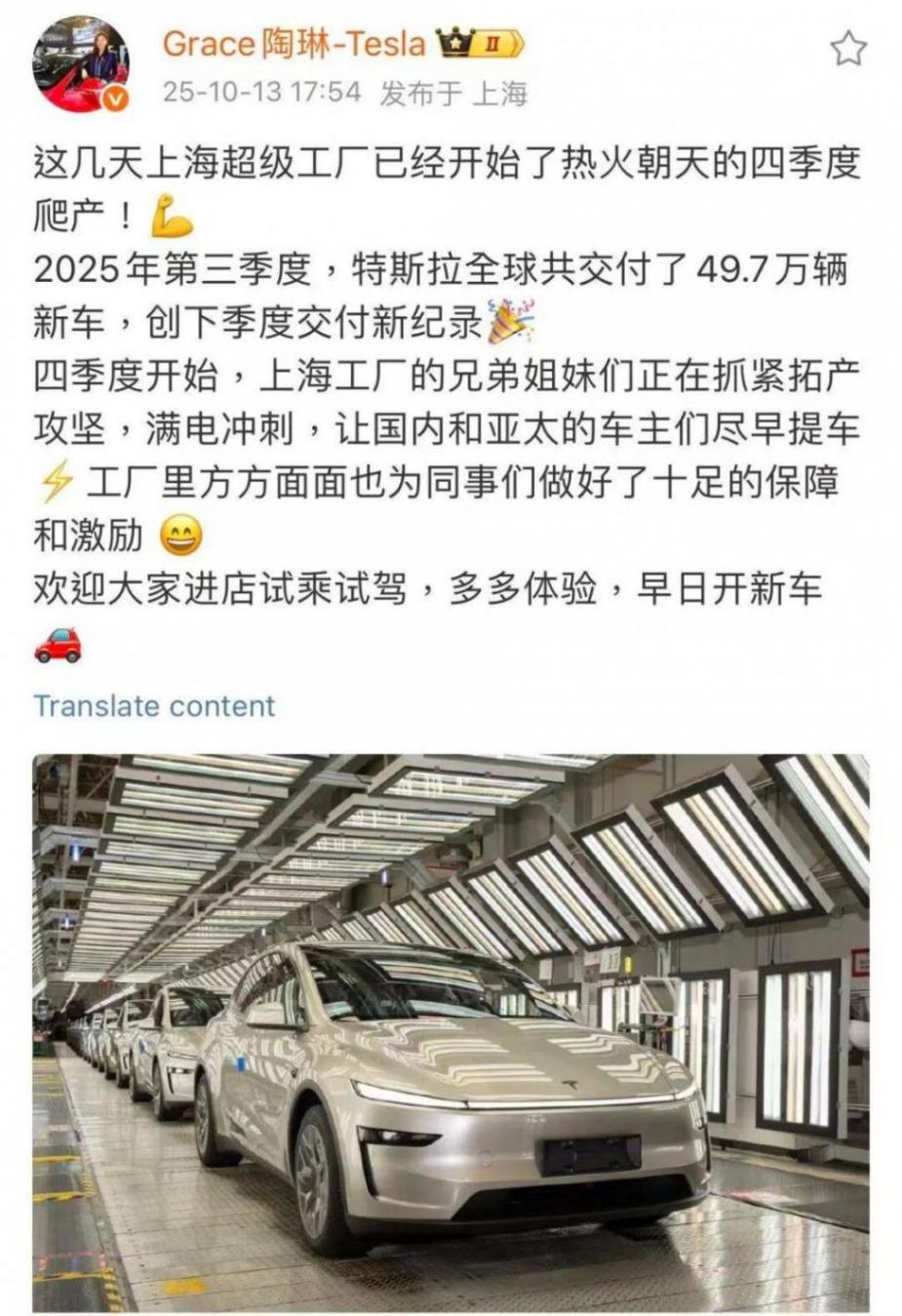 特斯拉副总裁陶琳2025年10月13日发了微博,提及“上海超级工厂已经开始了热火朝天的四季度爬产”。爬产说明,特斯拉今年将超额完成年度目标。