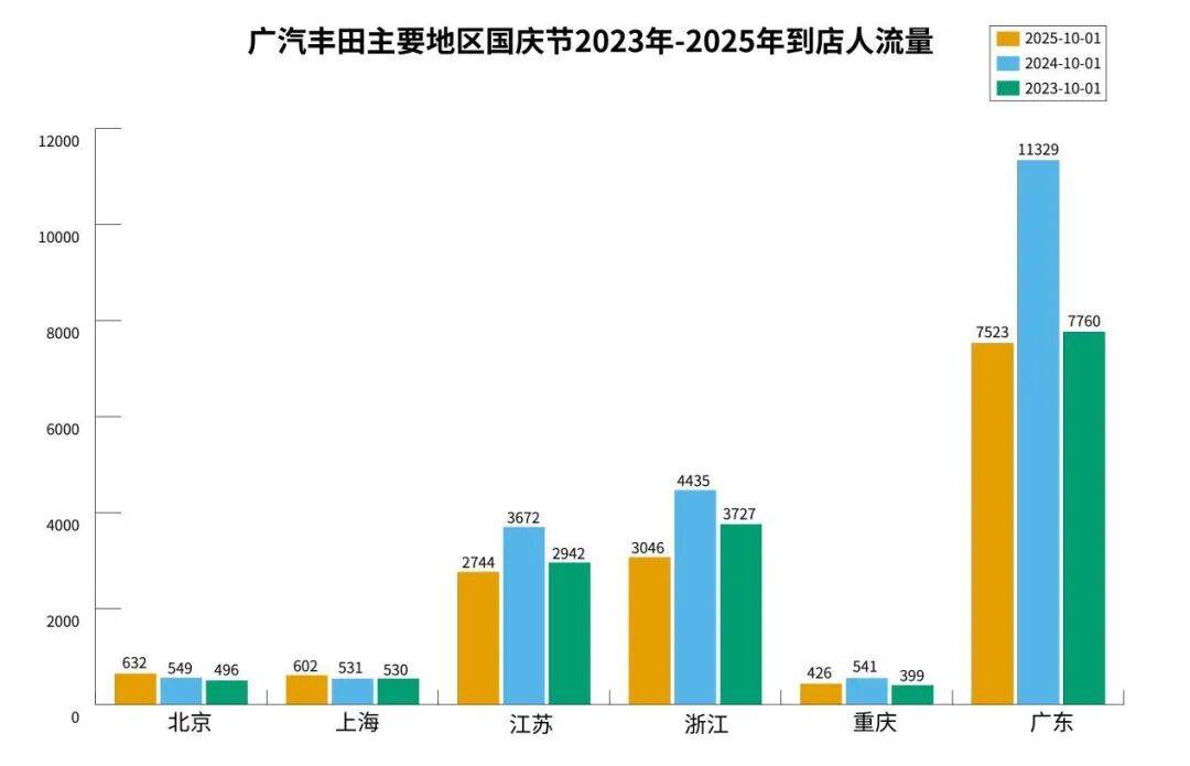 依据2023年、2024年以及2025年连续三年国庆前后18天客流数据来看,一汽丰田的核心区域市场主要在广东、山东、浙江和江苏,其中,广东处于遥遥领先的地位。