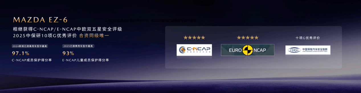 而在EZ-6车型方面,其自2024年10月以来,接连获得Top Safety中国汽车极致安全巅峰挑战认证和001号顶级安全证书、C-NCAP五星安全评级、中保研C-IASI“车内乘员安全指数”、“车外行人安全指数”、“车辆辅助安全指数”三大板块10项G优秀评价、Euro NCAP五星认证且成为马自达在欧洲市场成人乘员保护得分率最高的车型。
