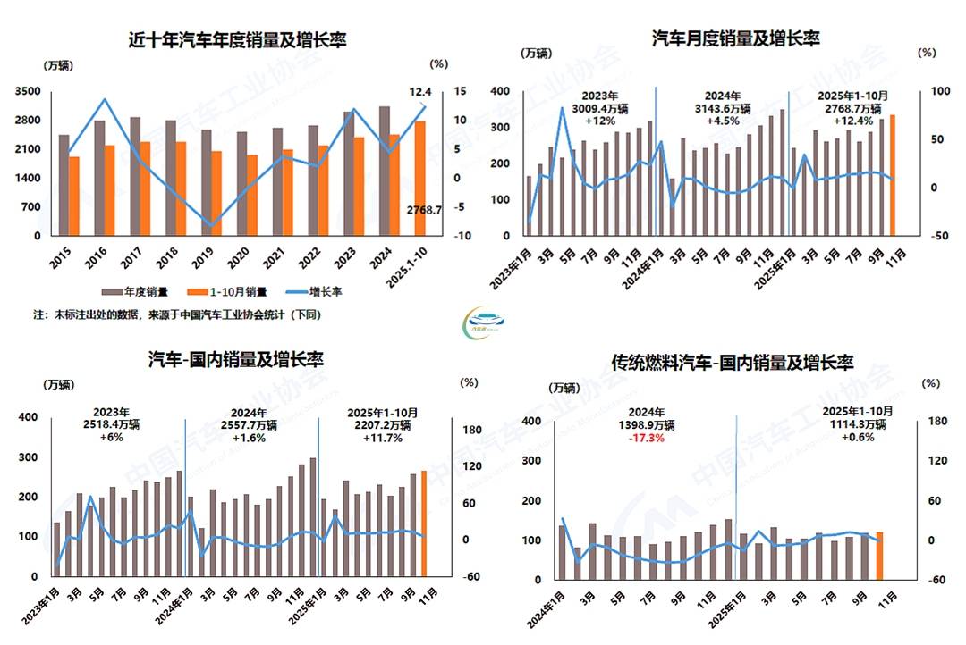 累计数据来看,汽车产销分别完成2769.2万辆和2768.7万辆,同比分别增长13.2%和12.4%,产销量增速较1-9月分别收窄0.1%和0.5%。