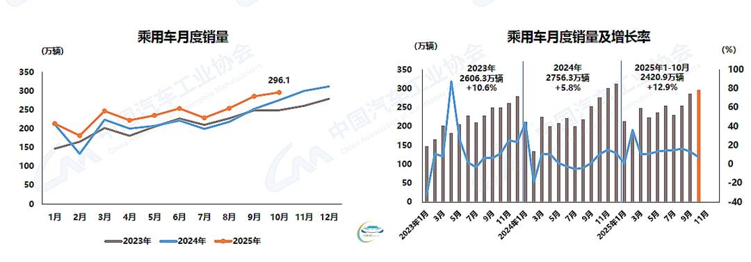 乘用车市场10月产销分别完成299.5万辆和296.1万辆,环比分别增长3.3%和3.6%,同比分别增长10.7%和7.5%。累计产销分别完成2423.7万辆和2420.9万辆,同比分别增长13.5%和12.9%。