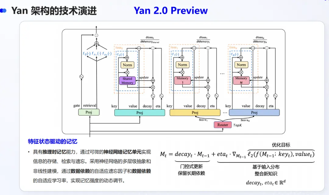 Yan 2.0 Preview的核心在于,其通过可微的记忆模块来实现信息的存储、检索和遗忘,前向过程可分为记忆更新与记忆检索两个阶段。