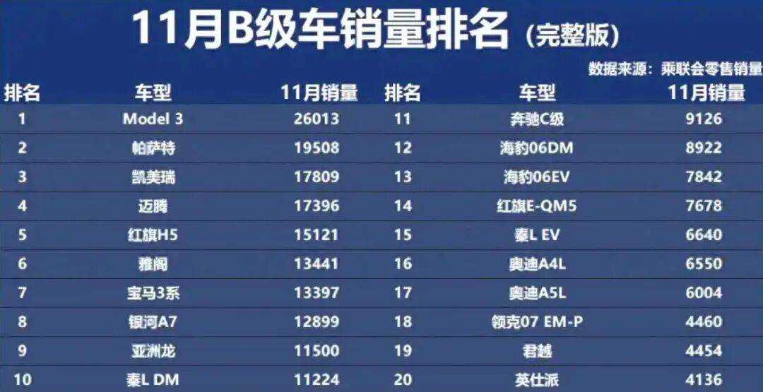11月份,B级车市场呈现“燃油车大胜、新能源抢位”的鲜明格局,燃油车型依旧是主力军,整体销量占比超过六成;在所有车型中,上汽大众帕萨特位列第二,在燃油车细分市场中,妥妥还是销冠。