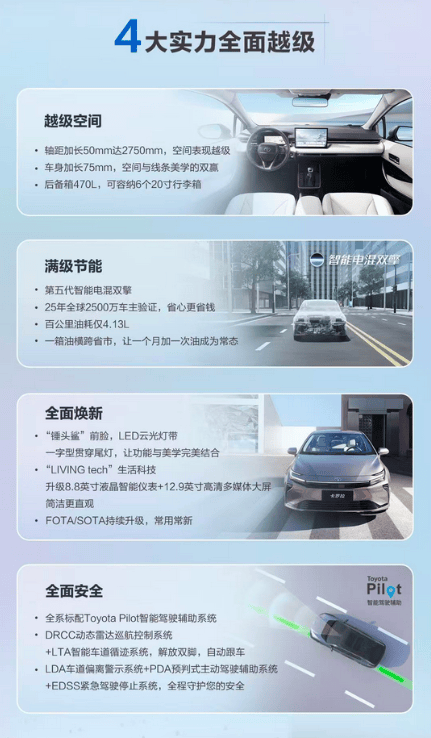 它的定位相当清晰,就是为“稳中求进的生活质享家”而来,这群人要品质、要省油、要空间,更要性价比。、再看竞品对比,比亚迪秦L DM-i一直是10万级混动家轿的热门之选,满油满电续航超1200km的表现确实亮眼,但全新卡罗拉双擎的优势更戳日常通勤痛点:百公里油耗低至4.13L,比秦L DM-i的馈电油耗更有优势,而且不用依赖充电桩,加油就能跑,对充电设施不完善的地区用户来说更实用。