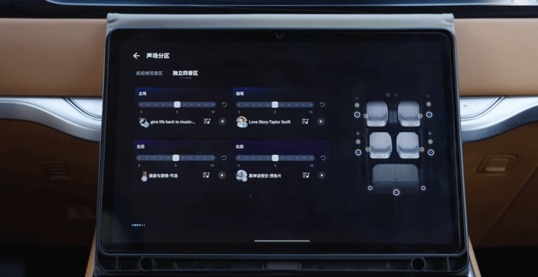 三是智能联动功能升级,不仅实现了兼顾私密性的声场分区,还有能联动氛围灯达成声光同步,强化座舱氛围感。