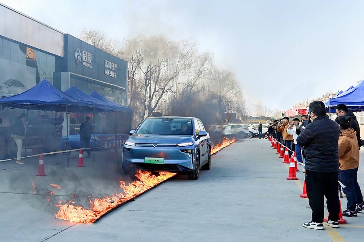 烈焰直接舔舐着车辆底盘,这是对电池包隔热、防火设计及整车热管理系统的极端暴力测试。在众人屏息凝视下,车辆平稳穿越火线,全程未发生任何意外状况。驶离火焰后,同样一切如常。水火双重考验全通关,启辰汽车以最震撼的视觉语言,将“安全”二字烙入每个在场嘉宾的心中。
