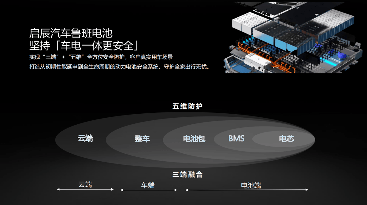 极限测试是瞬间的高光,但安全的保障却源于日常的积累与体系的构建。启辰汽车提出“车电一体大安全”理念,建立起包含“电芯、BMS、电池包、整车以及云端”的全链路、多维度防护体系。