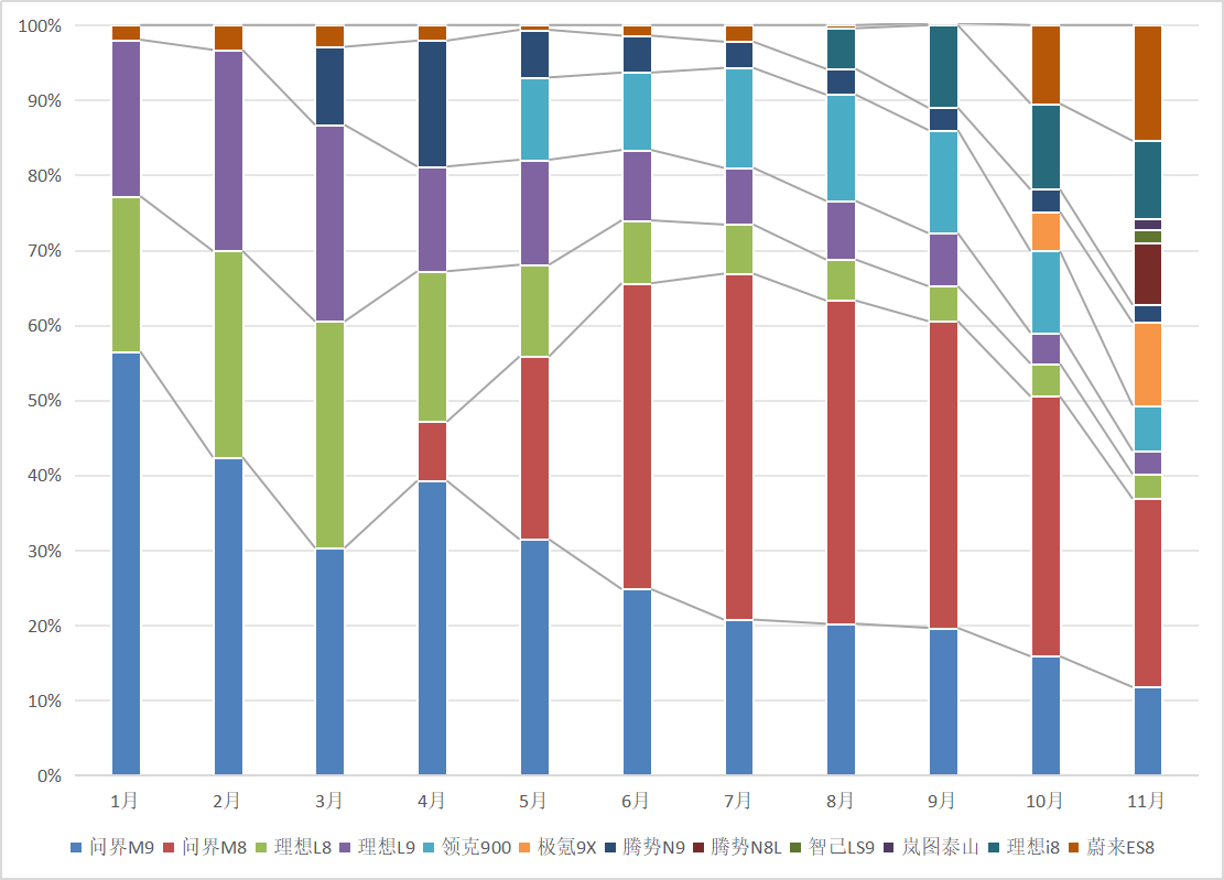 ▲1-11月新能源大三排SUV市场份额变化(*数据来源:上险数 *M8/M9含5座)
