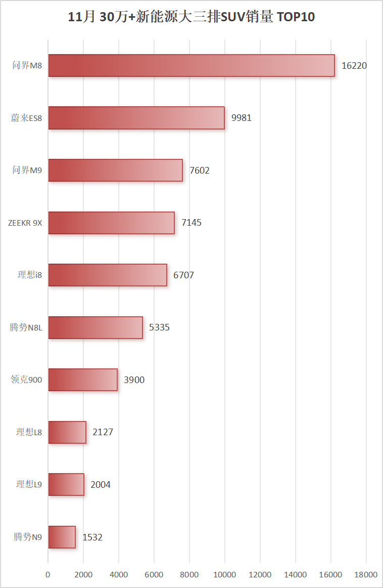 ▲11月,30万+新能源大三排SUV销量TOP10(*数据来源:上险数 *M8/M9含5座)