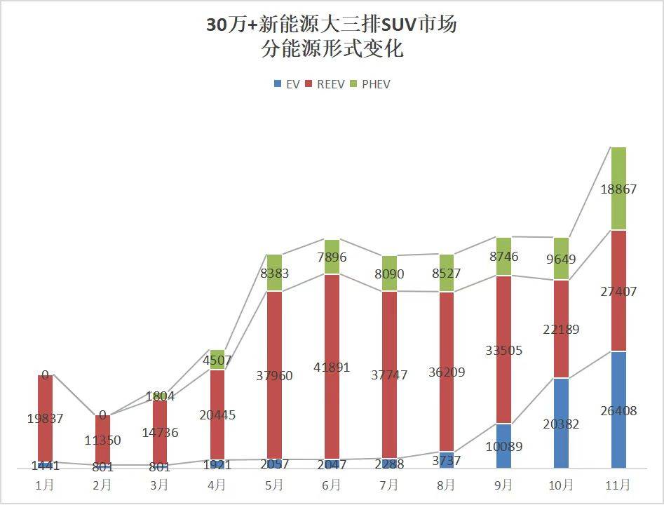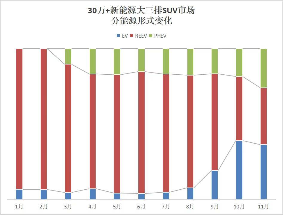 从8月纯电大三排SUV的份额出现异动开始,到11月,纯电的份额已悄然来到4成。