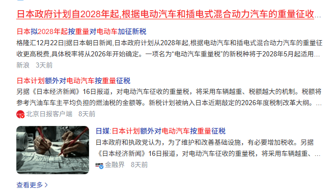 据日本《朝日新闻》报道,日本政府计划自2028年起,根据电动汽车和插电式混合动力汽车的重量征收更高税费,具体税率将从2026年开始确定。
