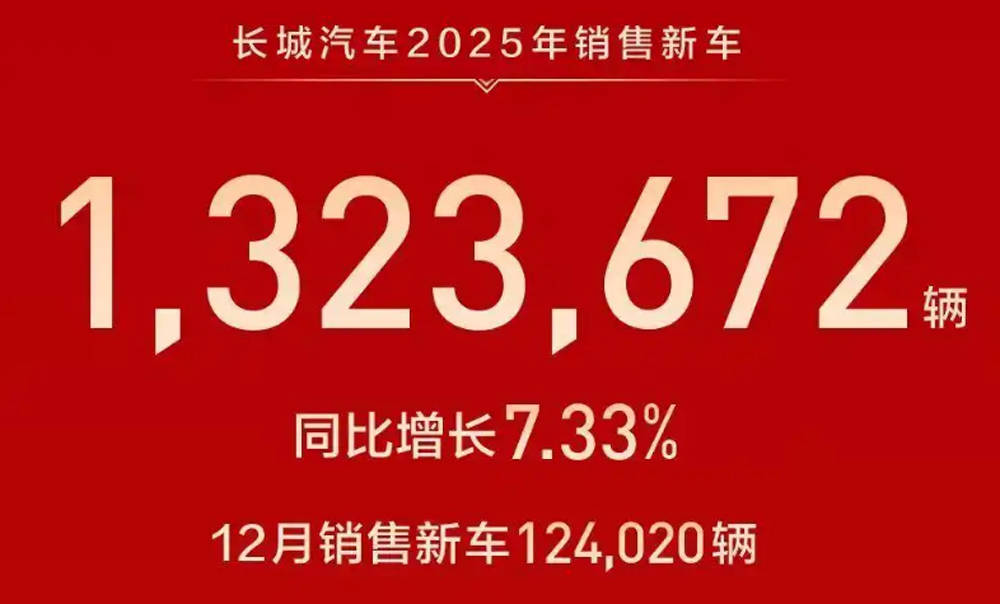 根据公开的销售数据显示,长城汽车2025年12月销量为124020台,环比同比都出现了一定程度的下滑。2025年1-12月累计销量达到1323672台,同比增长7.33%,其中,新能源汽车全年总销量为403653台,同比增长25.44%。牢牢守住年销100万辆俱乐部成员资格,也是不争的事实。