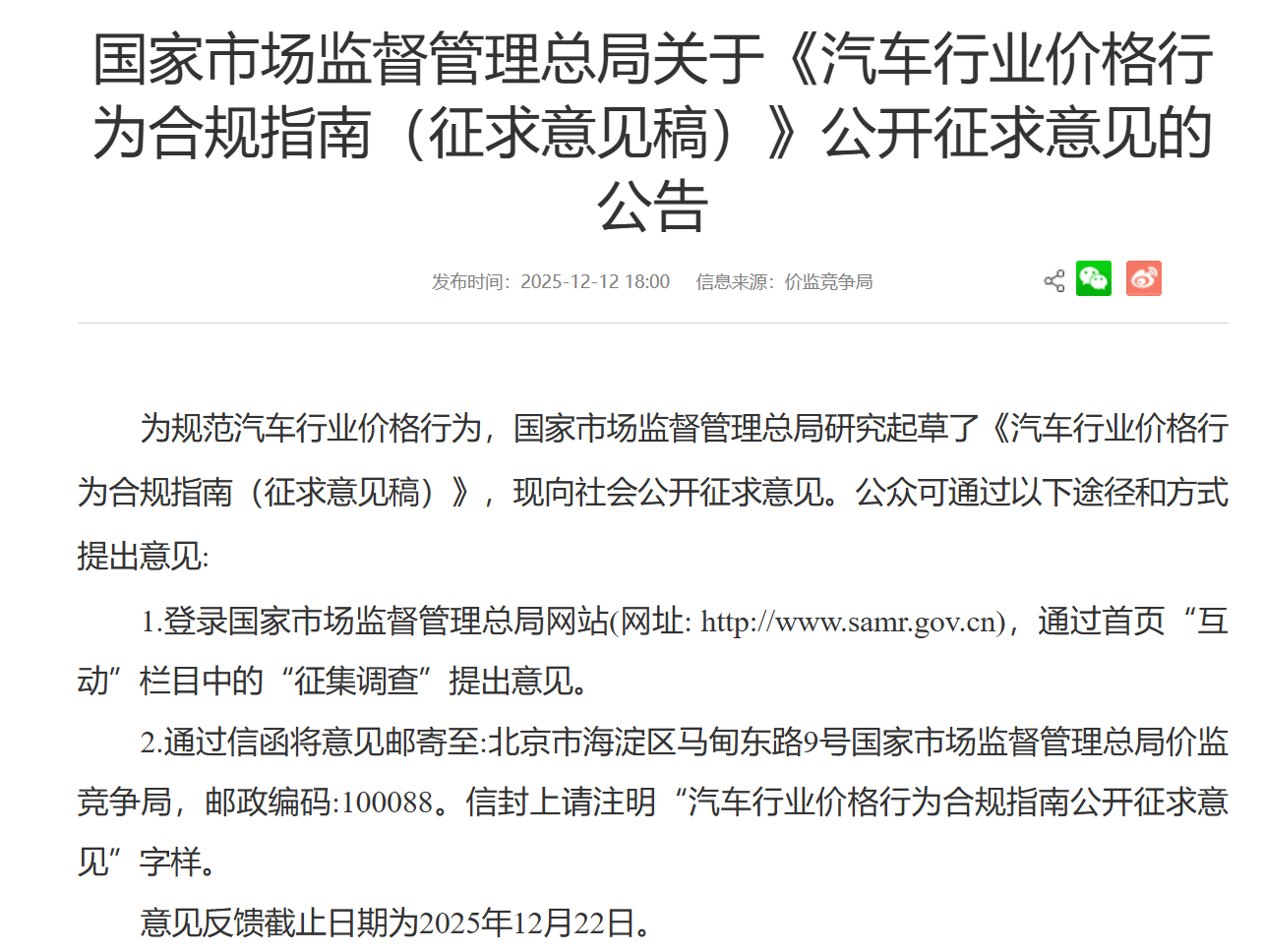 12月12日,市场监管总局进一步发布《汽车行业价格行为合规指南(征求意见稿)》,统一监管标准,明确价格行为边界,引导行业回归理性竞争。