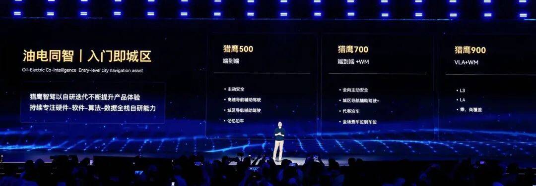 在汽车品类上,尤其是智能驾驶领域,猎鹰智驾系统不断升级。猎鹰500新增城区导航辅助驾驶,实现了“油电同智”;猎鹰700推动高阶智驾普及;猎鹰900则明确了L3/L4级自动驾驶的乘商两用路径。