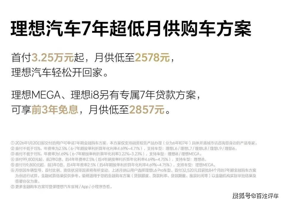 这是继特斯拉和小米之后,第三家在中国推7年分期的新势力。特斯拉1月6日率先出手,给Model 3和Model Y上了7年低息贷;小米1月15日跟进,为YU7也搞了类似政策。理想这次动作很快,明显不想掉队。