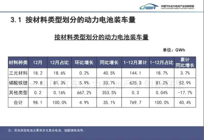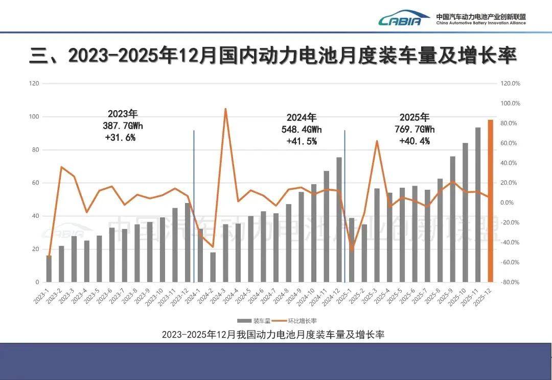值得注意的是,12月单月磷酸铁锂装车量达79.8GWh(占比81.3%),三元电池为18.2GWh(占比18.6%),技术路线格局与全年趋势高度一致。
