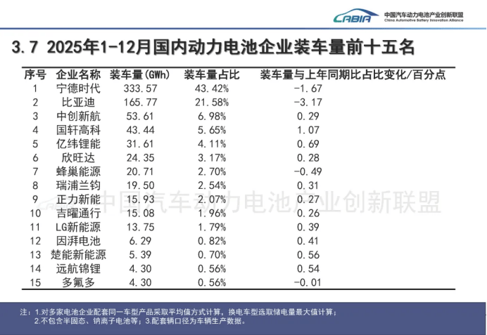 宁德时代2025年国内装车量约333.57GWh,市占率约为43.42%,较2024年下降约1.67个百分点;