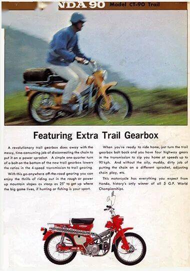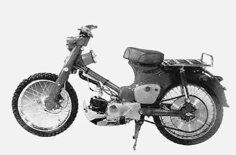为了适应在非铺装路面上所需要的动力,本田将后牙盘加大,来换取更大的减速比来提升爬坡能力,排气管换成短管,腿部挡板拆除,并换上了越野胎,就这样,这台小车瞬间变成了一台野性十足的林道小怪兽。这台车由于其低廉的275美元的售价而备受欢迎(当时美国本田的新员工月薪为500美元),这也带动了Super Cub在美国的销量,后续本田将这种风格正规化,并逐步改进。