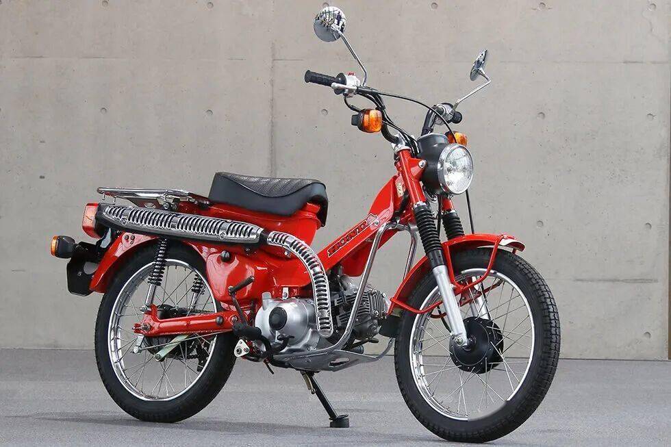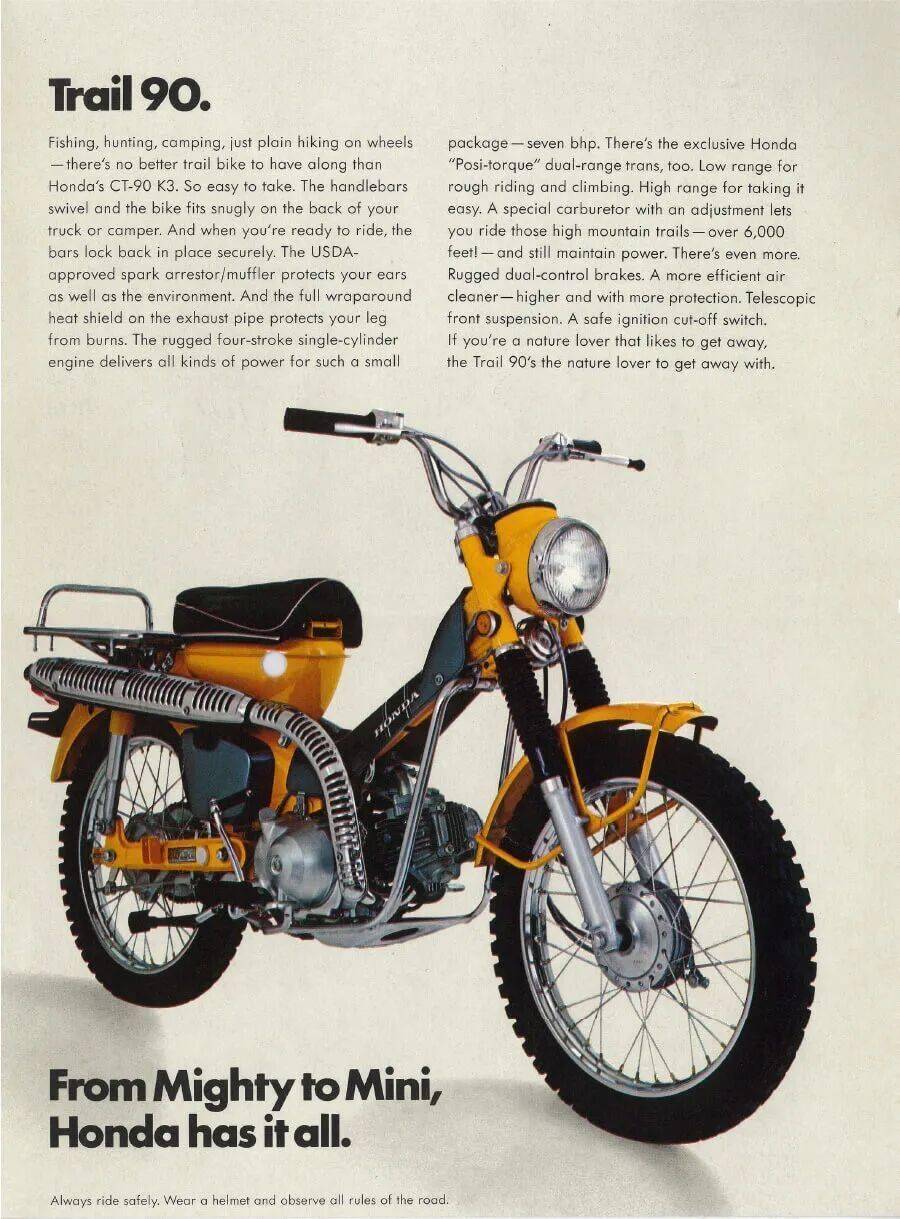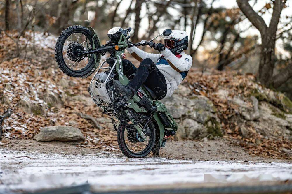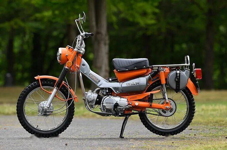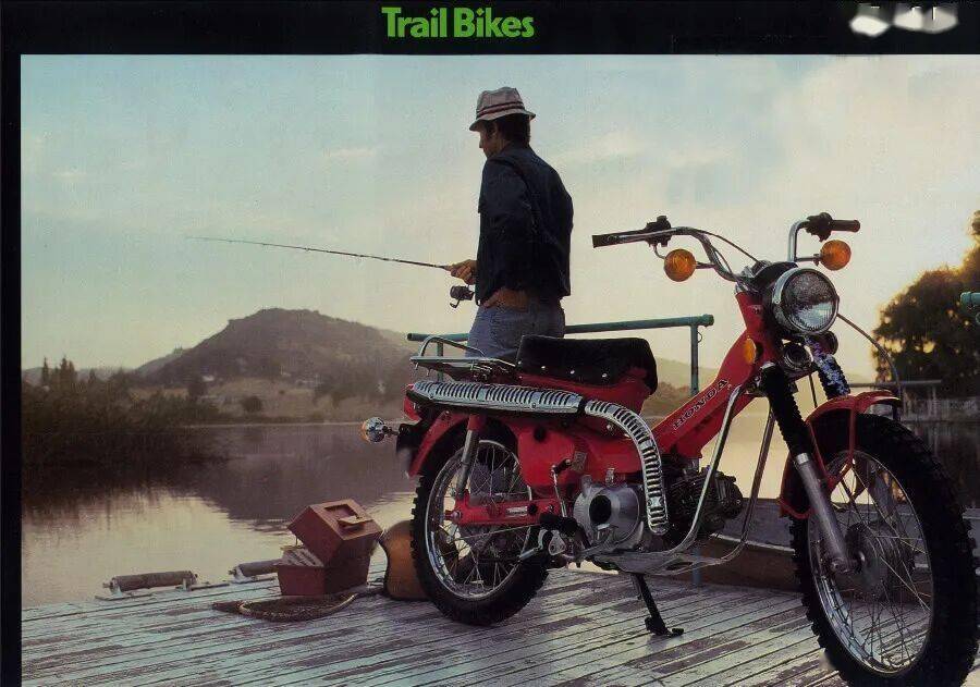 但是美国的限售团队敏锐的注意到了一个点,就是他们会开着皮卡车带着各种休闲露营的装备去野外郊游钓鱼,于是他们便将Super Cub卖给经营户外运动用品的商店,于是乎,这些美国的户外爱好者们开始关注这台小车,他们会把车放在皮卡的斗里,开到海滩或山上,遇到无法开车过的路时,他们就骑着Cub继续前行。在美国这样一个几乎人人都是手搓大佬的地方自然就有人琢磨改装这台车,有的人就把这台车改成了越野,美国本田看到了这一点,请日本本土公司来开发越野版的Cub,CA100T Trail 50就是这么来的。