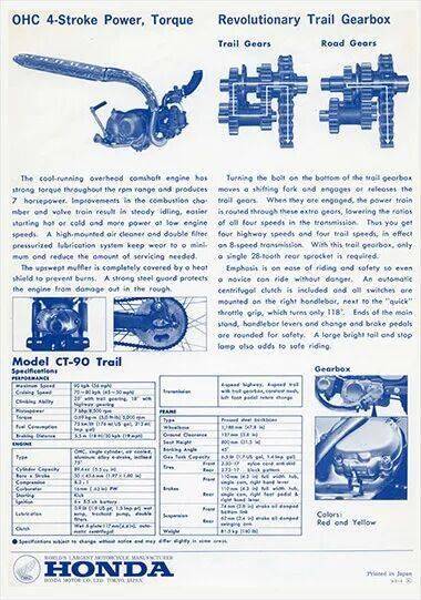 CT90从1969年销售至1979年,期间经历了多次改动,加装了副油箱,坐垫增加了铆钉,车头增加了转向灯,后避震的装饰盖拆除。