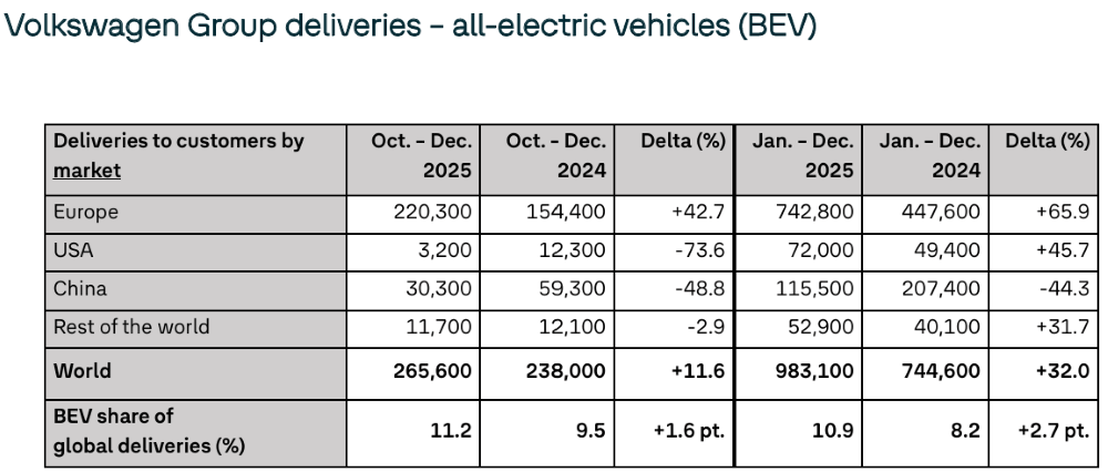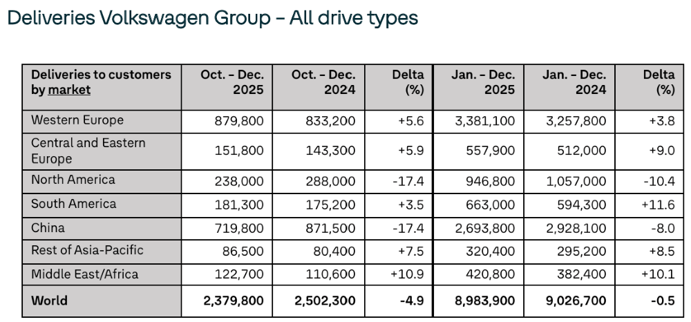 其中不同区域的表现分化明显,大众汽车集团2025年在欧洲市场销量增长4.5%,其中在“大本营”德国增长5.6%,在南美市场销量大增11.6%,北美市场的销量则由于美国的关税局势而下滑10.4%。