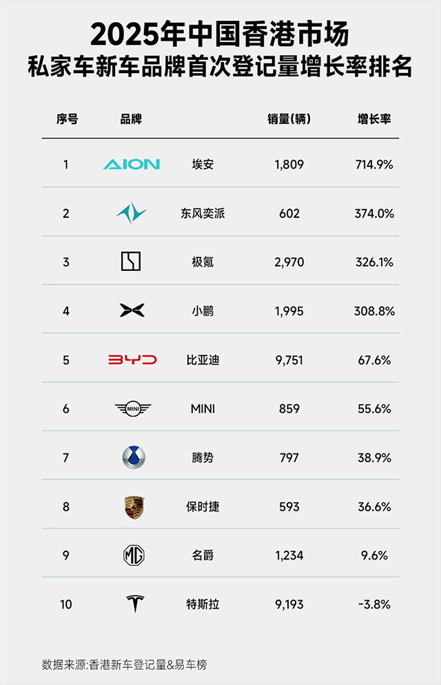 2026年1月,中汽数研发布了2025年香港私家车(乘用车)新车登记榜单(相当于大陆的上牌量),埃安以714.9%的同比增长率登顶增幅榜,冲劲极足。考虑到香港新车市场整体不过4万多辆的体量,超高增长率的价值还是很大的。