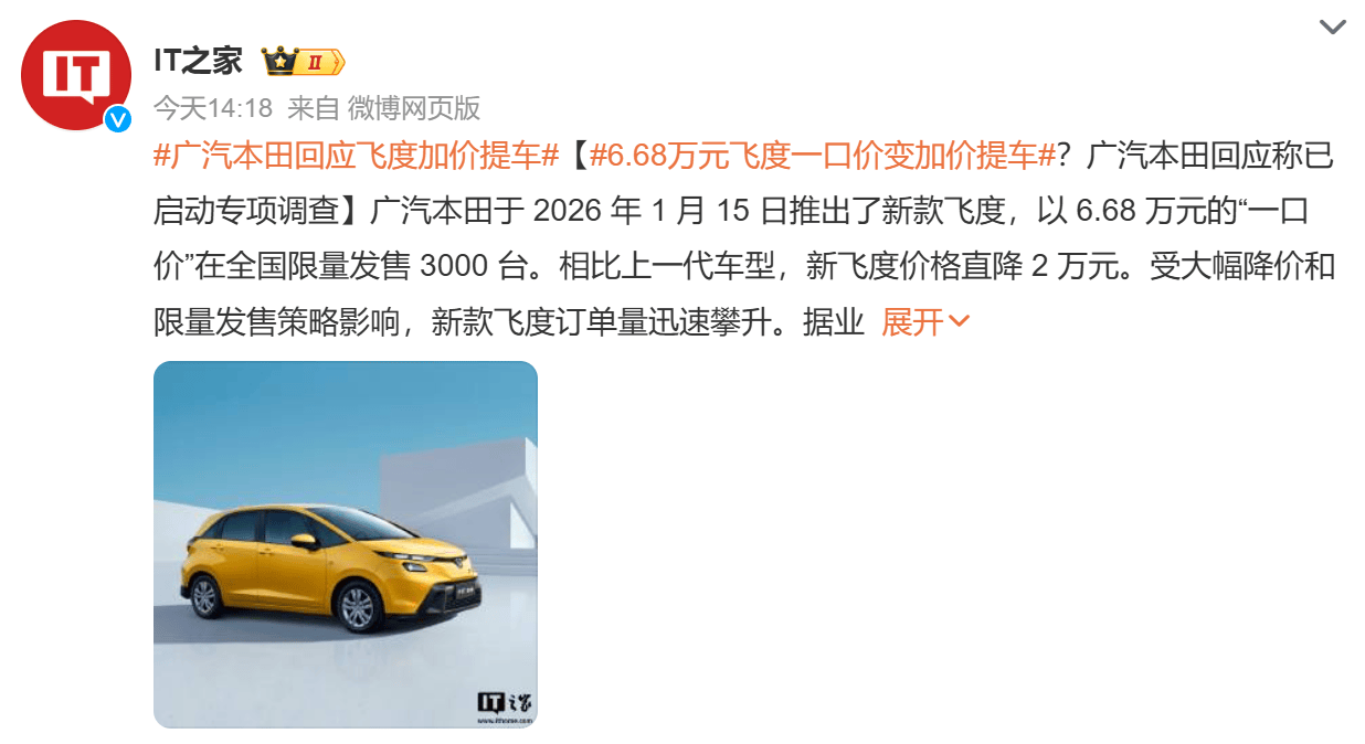 根据相关数据显示,广汽本田飞度2025年累计销量为2695辆,这款曾经的“平民超跑”几乎被市场淘汰。然而新款飞度在1月15日以以6.68万元的价格上市,限量3000台,48小时内,订单量直接突破5000辆。网传在部分经销商处甚至出现了以“配额紧张”为由的包括代办上牌、装潢、车漆选装等捆绑收费。